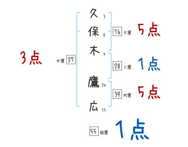 天運![]() | 久保木鷹広さんの天運は16画の5つ星!人望が厚く大きく発展する。逆転成功が見える。 家系が持つ宿命的な運勢を表します。祖先から受け継いだ苗字ですので自分の力が及びません。家柄を象徴します。 |