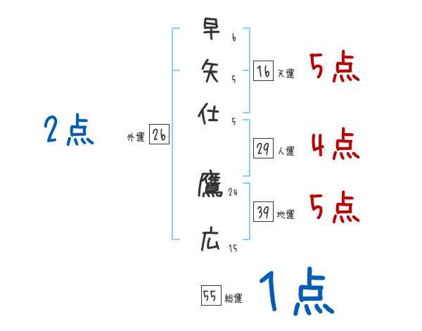 天運![]() | 早矢仕鷹広さんの天運は16画の5つ星!人望が厚く大きく発展する。逆転成功が見える。 家系が持つ宿命的な運勢を表します。祖先から受け継いだ苗字ですので自分の力が及びません。家柄を象徴します。 |
