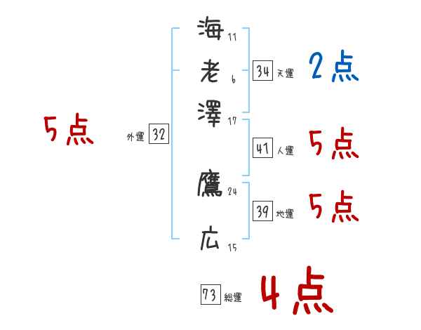 外運![]() | 海老澤鷹広さんの外運は32画の5つ星!柔軟性があり成功する。チャンスが多く金運が良い。 生活面を象徴する運勢です。外部から受ける影響力を表し、結婚運、家庭運や職場、環境への順応性を表します。 |