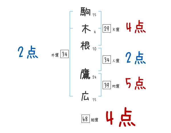 天運![]() | 駒木根鷹広さんの天運は29画の4つ星!完全主義で才能がある。厳格な心の持ち主。 家系が持つ宿命的な運勢を表します。祖先から受け継いだ苗字ですので自分の力が及びません。家柄を象徴します。 |