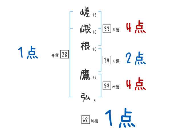 天運![]() | 嵯峨根鷹弘さんの天運は33画の4つ星!権力志向でプライドが高い。勇気があり運を切り開き成功する。 家系が持つ宿命的な運勢を表します。祖先から受け継いだ苗字ですので自分の力が及びません。家柄を象徴します。 |