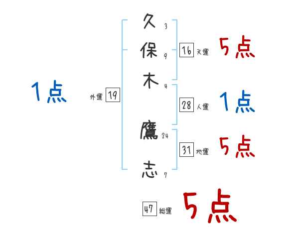 人運![]() | 久保木鷹志さんの人運は28画の1つ星!家庭環境に注意。スポーツで活躍できる能力があるかも。 性格や才能などを表す2番目に重要な運勢です。人間関係や協調性、社会的な成功に影響します。主に20歳から50歳ぐらいまでの中年期の運勢を表します。 |