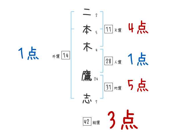 天運![]() | 二本木鷹志さんの天運は11画の4つ星!着実に富や地位を得る幸運な人生。 家系が持つ宿命的な運勢を表します。祖先から受け継いだ苗字ですので自分の力が及びません。家柄を象徴します。 |