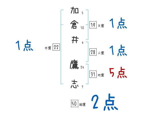 人運![]() | 加倉井鷹志さんの人運は28画の1つ星!家庭環境に注意。スポーツで活躍できる能力があるかも。 性格や才能などを表す2番目に重要な運勢です。人間関係や協調性、社会的な成功に影響します。主に20歳から50歳ぐらいまでの中年期の運勢を表します。 |