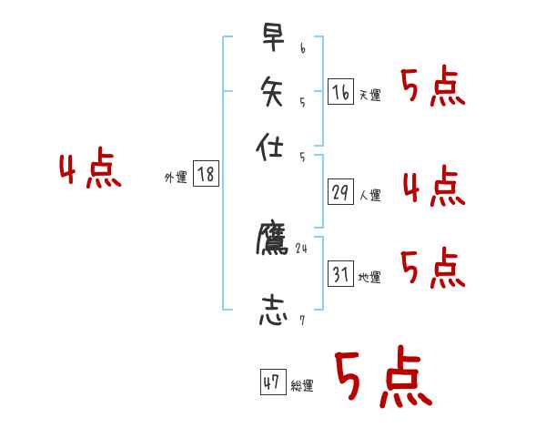 天運![]() | 早矢仕鷹志さんの天運は16画の5つ星!人望が厚く大きく発展する。逆転成功が見える。 家系が持つ宿命的な運勢を表します。祖先から受け継いだ苗字ですので自分の力が及びません。家柄を象徴します。 |