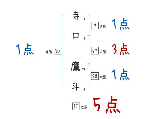 天運![]() | 寺口鷹斗さんの天運は9画の1つ星!消極的で才能を発揮することが苦手なことも。周りの意見に耳を傾けましょう。 家系が持つ宿命的な運勢を表します。祖先から受け継いだ苗字ですので自分の力が及びません。家柄を象徴します。 |