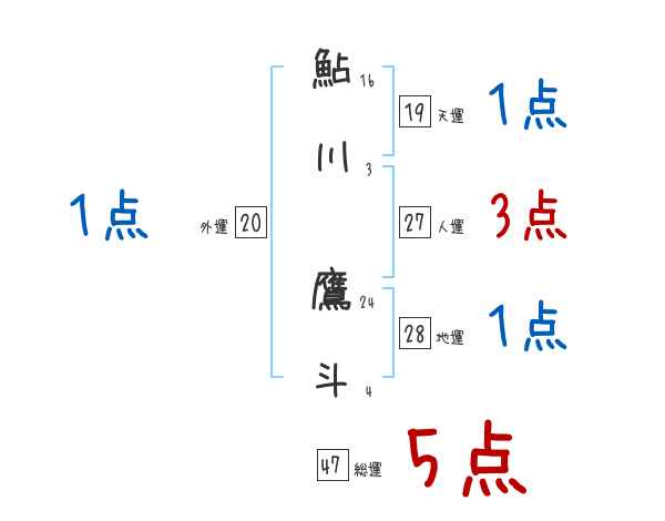 天運![]() | 鮎川鷹斗さんの天運は19画の1つ星!優れた才能を持ちますが、協調性が足りないことも。周りの人と協力する事を意識しましょう。 家系が持つ宿命的な運勢を表します。祖先から受け継いだ苗字ですので自分の力が及びません。家柄を象徴します。 |