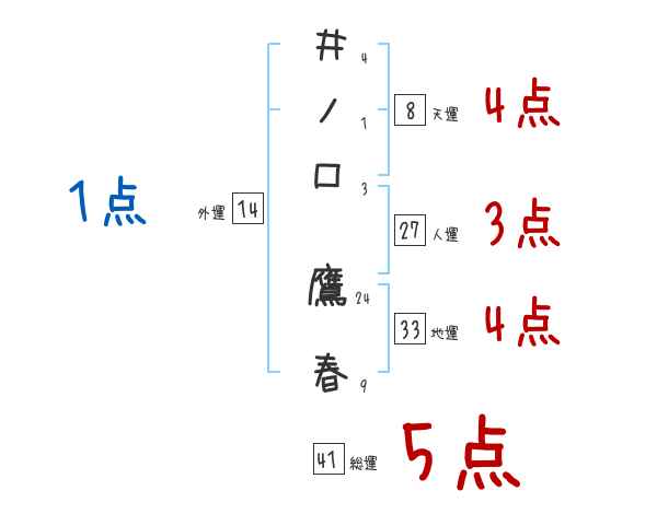 天運![]() | 井ノ口鷹春さんの天運は8画の4つ星!勤勉家。根気強く努力し成功する。忍耐力がある。 家系が持つ宿命的な運勢を表します。祖先から受け継いだ苗字ですので自分の力が及びません。家柄を象徴します。 |