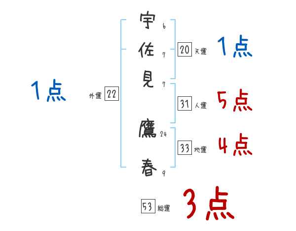 総運![]() | 宇佐見鷹春さんの総運は53画の3つ星!やや見栄っ張りで虚栄心がある。散財に注意。 あなたの人生を表す1番重要な運勢です。生涯を通じて影響する総合運となり、主に50歳以降の晩年期に影響を及ぼします。 |