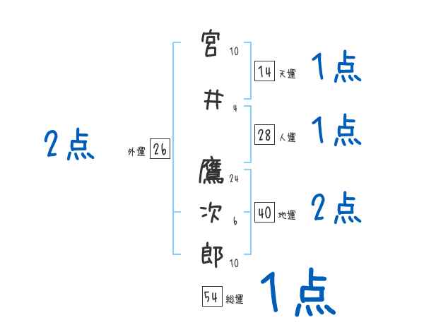 人運![]() | 宮井鷹次郎さんの人運は28画の1つ星!家庭環境に注意。スポーツで活躍できる能力があるかも。 性格や才能などを表す2番目に重要な運勢です。人間関係や協調性、社会的な成功に影響します。主に20歳から50歳ぐらいまでの中年期の運勢を表します。 |
