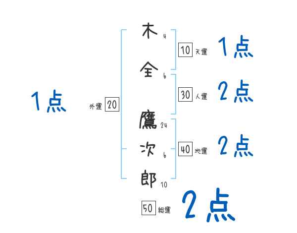 天運![]() | 木全鷹次郎さんの天運は10画の1つ星!不安を感じやすい傾向。ストレスを抱えないように注意しましょう。 家系が持つ宿命的な運勢を表します。祖先から受け継いだ苗字ですので自分の力が及びません。家柄を象徴します。 |