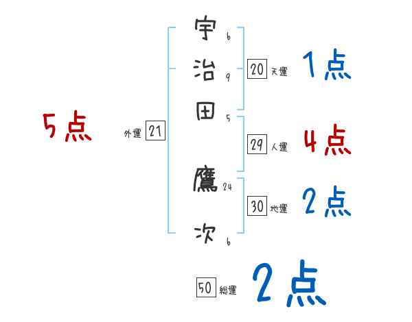 人運![]() | 宇治田鷹次さんの人運は29画の4つ星!完全主義で才能がある。厳格な心の持ち主。 性格や才能などを表す2番目に重要な運勢です。人間関係や協調性、社会的な成功に影響します。主に20歳から50歳ぐらいまでの中年期の運勢を表します。 |
