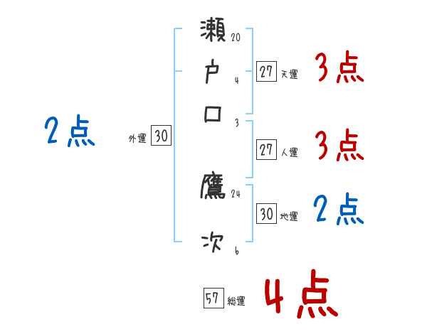 総運![]() | 瀬戸口鷹次さんの総運は57画の4つ星!向上心があり人望がある。地位を得る。 あなたの人生を表す1番重要な運勢です。生涯を通じて影響する総合運となり、主に50歳以降の晩年期に影響を及ぼします。 |