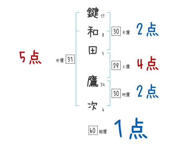 天運![]() | 鍵和田鷹次さんの天運は30画の2つ星!浮き沈みの激しさに注意しましょう。 家系が持つ宿命的な運勢を表します。祖先から受け継いだ苗字ですので自分の力が及びません。家柄を象徴します。 |