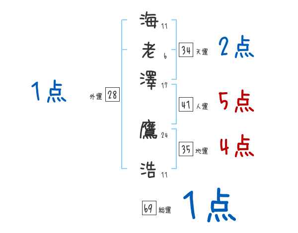 人運![]() | 海老澤鷹浩さんの人運は41画の5つ星!大志を抱き、目標に向かって実力を発揮し達成する。温和な性格。 性格や才能などを表す2番目に重要な運勢です。人間関係や協調性、社会的な成功に影響します。主に20歳から50歳ぐらいまでの中年期の運勢を表します。 |