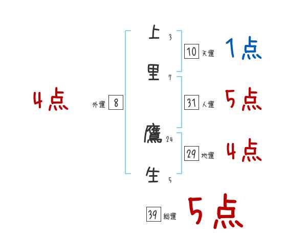 天運![]() | 上里鷹生さんの天運は10画の1つ星!不安を感じやすい傾向。ストレスを抱えないように注意しましょう。 家系が持つ宿命的な運勢を表します。祖先から受け継いだ苗字ですので自分の力が及びません。家柄を象徴します。 |