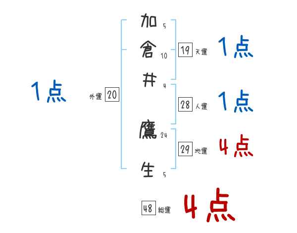 人運![]() | 加倉井鷹生さんの人運は28画の1つ星!家庭環境に注意。スポーツで活躍できる能力があるかも。 性格や才能などを表す2番目に重要な運勢です。人間関係や協調性、社会的な成功に影響します。主に20歳から50歳ぐらいまでの中年期の運勢を表します。 |