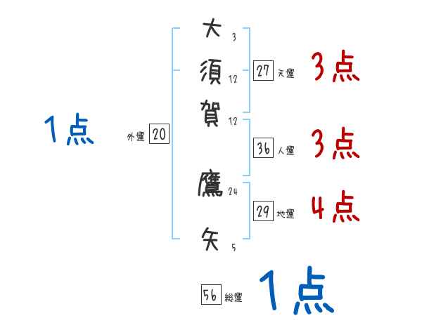 天運![]() | 大須賀鷹矢さんの天運は27画の3つ星!頭脳明晰だが強情で摩擦が多い傾向。孤立に注意。 家系が持つ宿命的な運勢を表します。祖先から受け継いだ苗字ですので自分の力が及びません。家柄を象徴します。 |