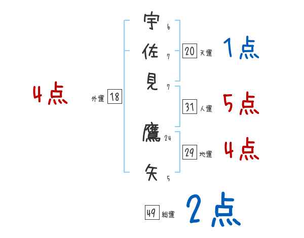 宇佐見鷹矢さんの画数の鑑定結果