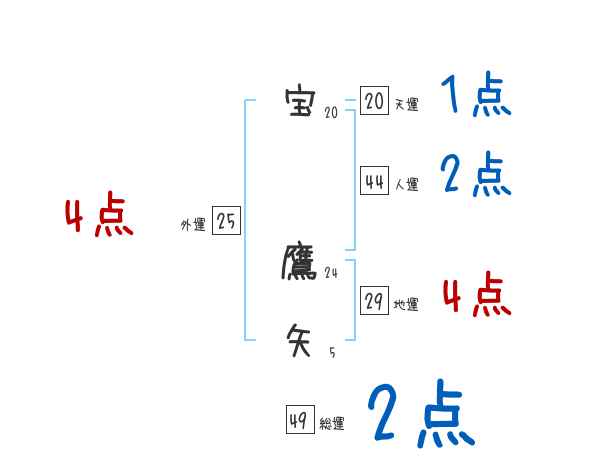 人運![]() | 宝鷹矢さんの人運は44画の2つ星!誠実で慎重な性格。物事を考えすぎないように注意しましょう。 性格や才能などを表す2番目に重要な運勢です。人間関係や協調性、社会的な成功に影響します。主に20歳から50歳ぐらいまでの中年期の運勢を表します。 |