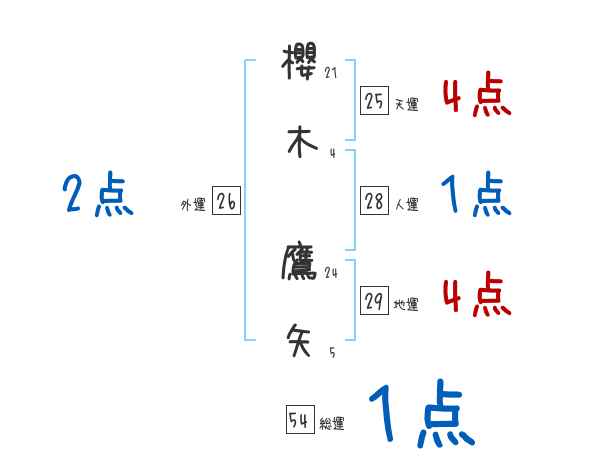 天運![]() | 櫻木鷹矢さんの天運は25画の4つ星!個性があり才能があふれる。強運の持ち主で発展する。 家系が持つ宿命的な運勢を表します。祖先から受け継いだ苗字ですので自分の力が及びません。家柄を象徴します。 |