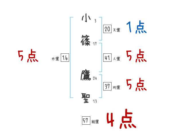 総運![]() | 小篠鷹聖さんの総運は57画の4つ星!向上心があり人望がある。地位を得る。 あなたの人生を表す1番重要な運勢です。生涯を通じて影響する総合運となり、主に50歳以降の晩年期に影響を及ぼします。 |