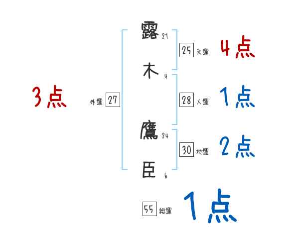 天運![]() | 露木鷹臣さんの天運は25画の4つ星!個性があり才能があふれる。強運の持ち主で発展する。 家系が持つ宿命的な運勢を表します。祖先から受け継いだ苗字ですので自分の力が及びません。家柄を象徴します。 |