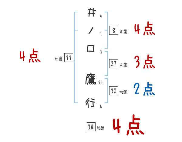 総運![]() | 井ノ口鷹行さんの総運は38画の4つ星!温厚な性格で技術的な才能を発揮する。職人的な仕事に向いている。 あなたの人生を表す1番重要な運勢です。生涯を通じて影響する総合運となり、主に50歳以降の晩年期に影響を及ぼします。 |