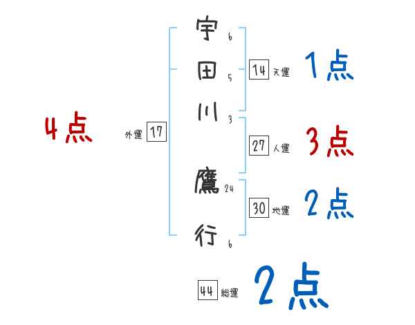 外運![]() | 宇田川鷹行さんの外運は17画の4つ星!積極的な行動力。地位を気づき財産を手に入れる。純粋な心と直感力。 生活面を象徴する運勢です。外部から受ける影響力を表し、結婚運、家庭運や職場、環境への順応性を表します。 |