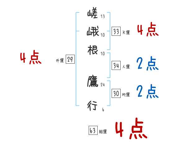 外運![]() | 嵯峨根鷹行さんの外運は29画の4つ星!完全主義で才能がある。厳格な心の持ち主。 生活面を象徴する運勢です。外部から受ける影響力を表し、結婚運、家庭運や職場、環境への順応性を表します。 |