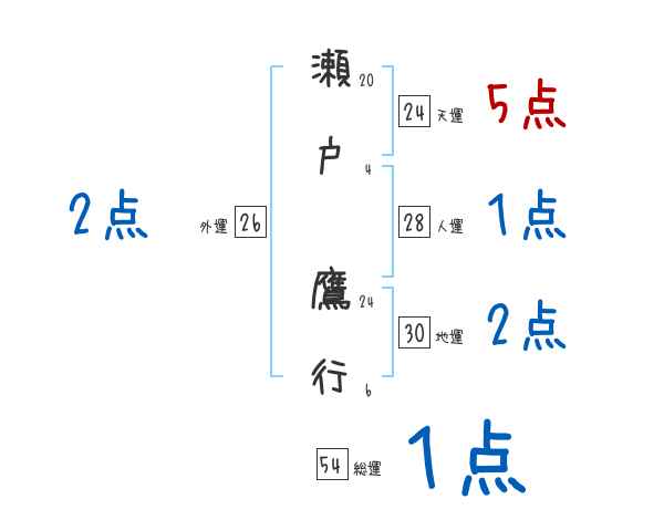 天運![]() | 瀬戸鷹行さんの天運は24画の5つ星!家庭運が良く順調な人生。金運にも恵まれる。 家系が持つ宿命的な運勢を表します。祖先から受け継いだ苗字ですので自分の力が及びません。家柄を象徴します。 |