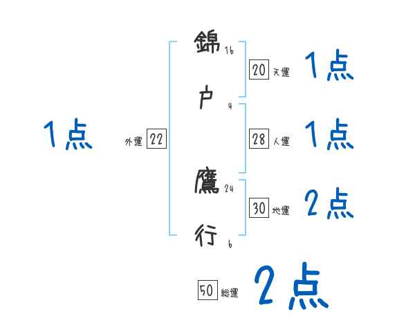 外運![]() | 錦戸鷹行さんの外運は22画の1つ星!努力することが苦手ないっぽう手先が器用。芸術性にも優れる。 生活面を象徴する運勢です。外部から受ける影響力を表し、結婚運、家庭運や職場、環境への順応性を表します。 |
