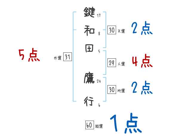 天運![]() | 鍵和田鷹行さんの天運は30画の2つ星!浮き沈みの激しさに注意しましょう。 家系が持つ宿命的な運勢を表します。祖先から受け継いだ苗字ですので自分の力が及びません。家柄を象徴します。 |