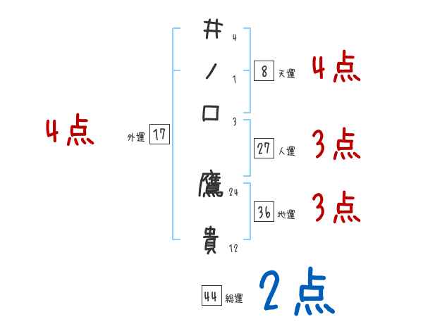 外運![]() | 井ノ口鷹貴さんの外運は17画の4つ星!積極的な行動力。地位を気づき財産を手に入れる。純粋な心と直感力。 生活面を象徴する運勢です。外部から受ける影響力を表し、結婚運、家庭運や職場、環境への順応性を表します。 |