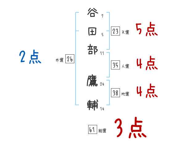天運![]() | 谷田部鷹輔さんの天運は23画の5つ星!想像力に優れ活力がある。一代で成功し名誉を手に入れる。 家系が持つ宿命的な運勢を表します。祖先から受け継いだ苗字ですので自分の力が及びません。家柄を象徴します。 |