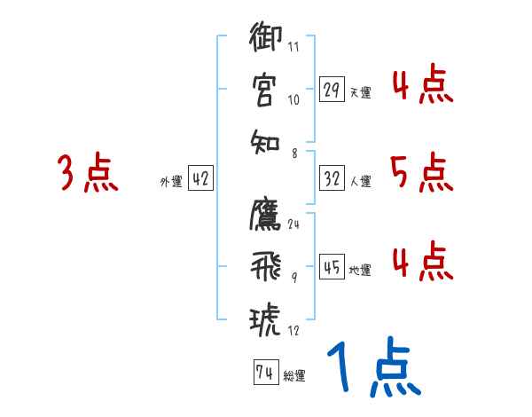 人運![]() | 御宮知鷹飛琥さんの人運は32画の5つ星!柔軟性があり成功する。チャンスが多く金運が良い。 性格や才能などを表す2番目に重要な運勢です。人間関係や協調性、社会的な成功に影響します。主に20歳から50歳ぐらいまでの中年期の運勢を表します。 |