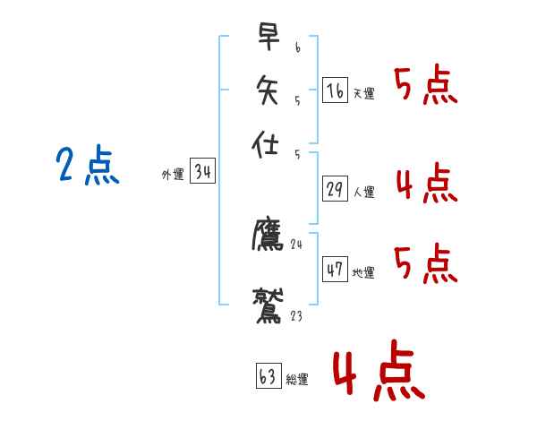 外運![]() | 早矢仕鷹鷲さんの外運は34画の2つ星!独創性に優れるが、自尊心が強く災難に注意しましょう。 生活面を象徴する運勢です。外部から受ける影響力を表し、結婚運、家庭運や職場、環境への順応性を表します。 |