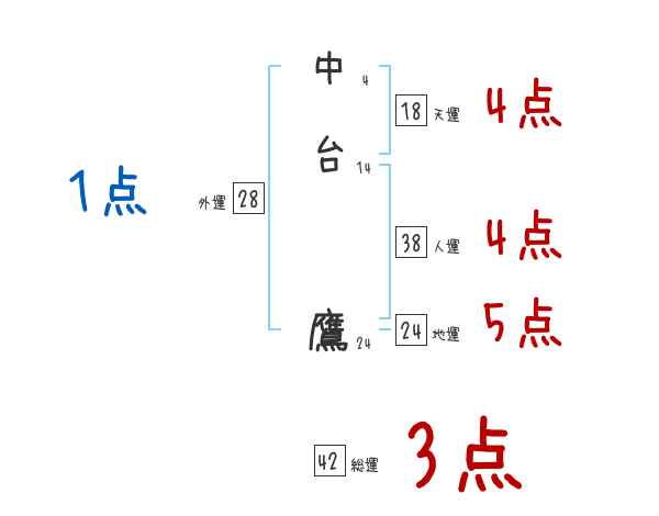 天運![]() | 中台鷹さんの天運は18画の4つ星!情熱的で剛気。忍耐力があり信頼される。 家系が持つ宿命的な運勢を表します。祖先から受け継いだ苗字ですので自分の力が及びません。家柄を象徴します。 |
