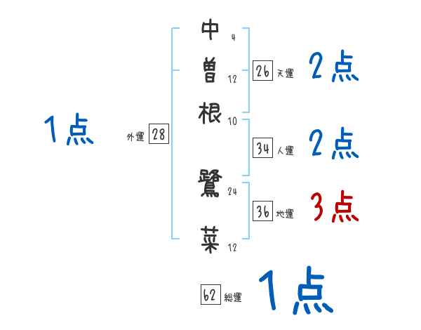 外運![]() | 中曽根鷺菜さんの外運は28画の1つ星!家庭環境に注意。スポーツで活躍できる能力があるかも。 生活面を象徴する運勢です。外部から受ける影響力を表し、結婚運、家庭運や職場、環境への順応性を表します。 |