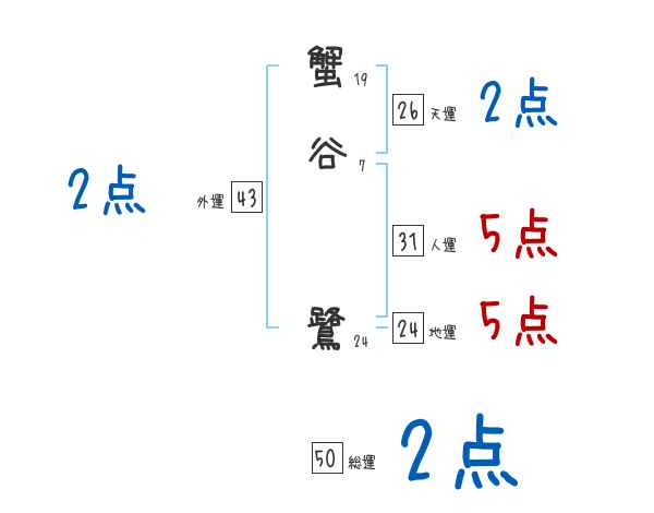 総運![]() | 蟹谷鷺さんの総運は50画の2つ星!浮き沈みが激しく不安定。しりすぼみに衰退しやすいので注意しましょう。 あなたの人生を表す1番重要な運勢です。生涯を通じて影響する総合運となり、主に50歳以降の晩年期に影響を及ぼします。 |