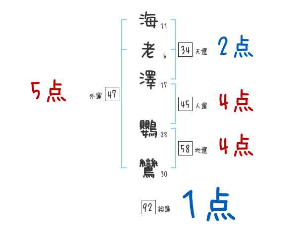 総運![]() | 海老澤鸚鸞さんの総運は92画の1つ星!簡単な失敗で諦めてしまいやすいかも。着実に行動すると良いでしょう。 あなたの人生を表す1番重要な運勢です。生涯を通じて影響する総合運となり、主に50歳以降の晩年期に影響を及ぼします。 |