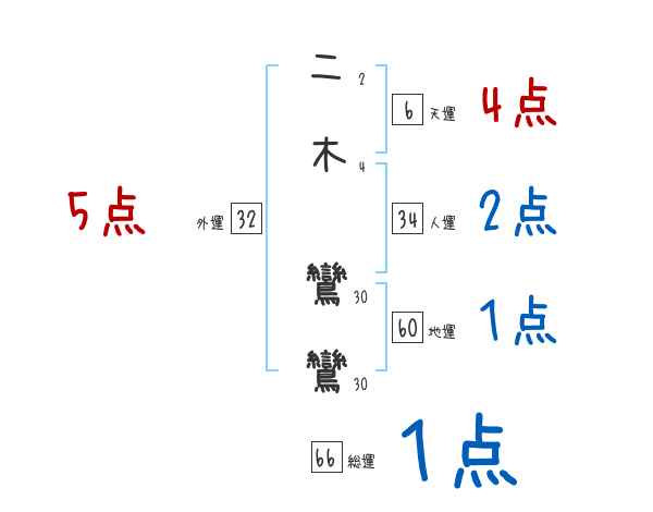 外運![]() | 二木鸞鸞さんの外運は32画の5つ星!柔軟性があり成功する。チャンスが多く金運が良い。 生活面を象徴する運勢です。外部から受ける影響力を表し、結婚運、家庭運や職場、環境への順応性を表します。 |