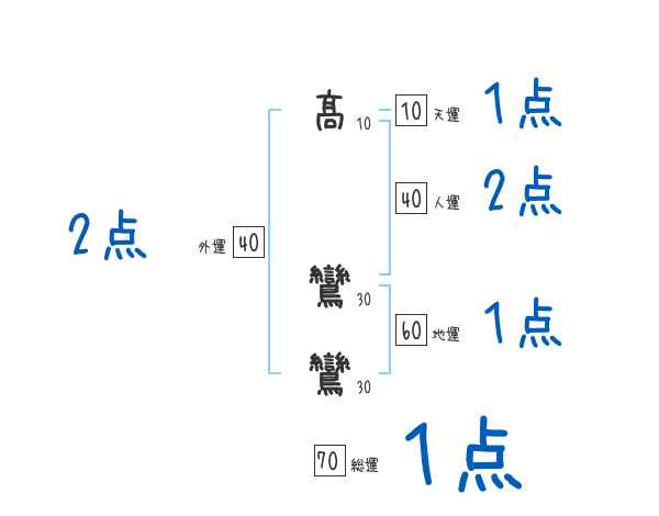 天運![]() | 髙鸞鸞さんの天運は10画の1つ星!不安を感じやすい傾向。ストレスを抱えないように注意しましょう。 家系が持つ宿命的な運勢を表します。祖先から受け継いだ苗字ですので自分の力が及びません。家柄を象徴します。 |