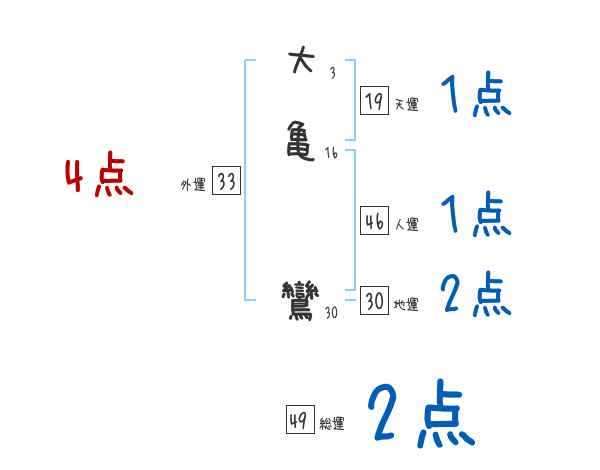 天運![]() | 大亀鸞さんの天運は19画の1つ星!優れた才能を持ちますが、協調性が足りないことも。周りの人と協力する事を意識しましょう。 家系が持つ宿命的な運勢を表します。祖先から受け継いだ苗字ですので自分の力が及びません。家柄を象徴します。 |
