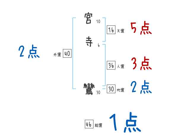 天運![]() | 宮寺鸞さんの天運は16画の5つ星!人望が厚く大きく発展する。逆転成功が見える。 家系が持つ宿命的な運勢を表します。祖先から受け継いだ苗字ですので自分の力が及びません。家柄を象徴します。 |