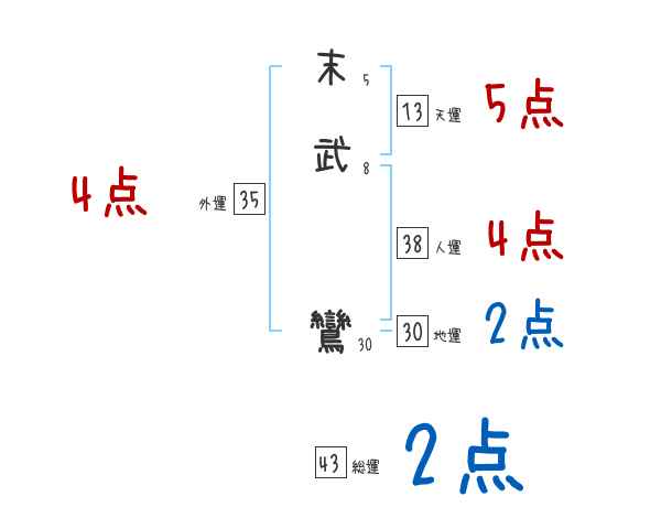 外運![]() | 末武鸞さんの外運は35画の4つ星!温厚な性格で感受性が高い。穏和な性格で人望が厚い。 生活面を象徴する運勢です。外部から受ける影響力を表し、結婚運、家庭運や職場、環境への順応性を表します。 |