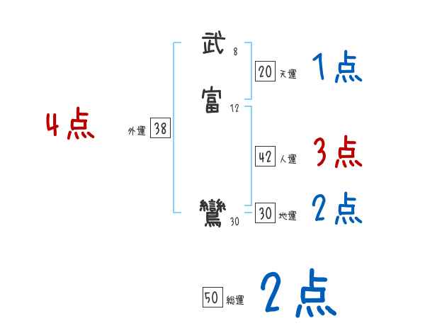 総運![]() | 武富鸞さんの総運は50画の2つ星!浮き沈みが激しく不安定。しりすぼみに衰退しやすいので注意しましょう。 あなたの人生を表す1番重要な運勢です。生涯を通じて影響する総合運となり、主に50歳以降の晩年期に影響を及ぼします。 |