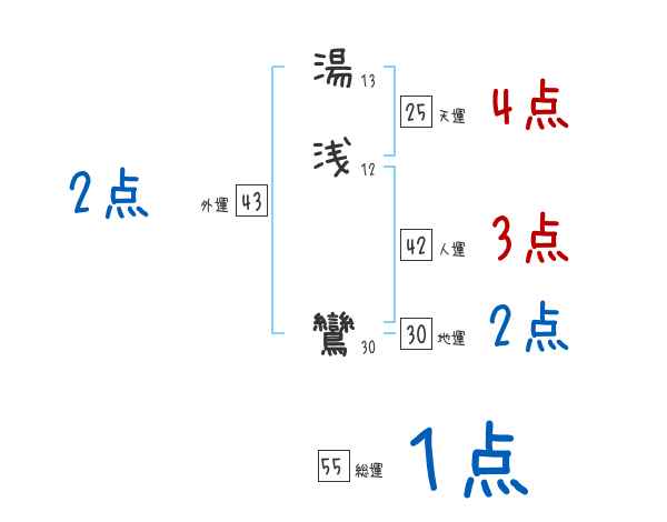 外運![]() | 湯浅鸞さんの外運は43画の2つ星!頑固な性格で独立心が強いかも。やや非現実的で浪費に注意しましょう。 生活面を象徴する運勢です。外部から受ける影響力を表し、結婚運、家庭運や職場、環境への順応性を表します。 |
