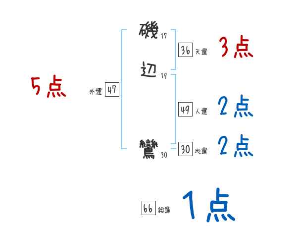外運![]() | 磯辺鸞さんの外運は47画の5つ星!実力が開花し発展する円満な人生。財に恵まれる。 生活面を象徴する運勢です。外部から受ける影響力を表し、結婚運、家庭運や職場、環境への順応性を表します。 |