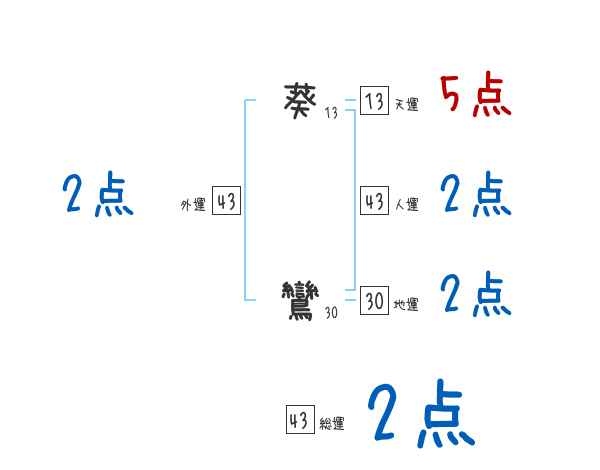 総運![]() | 葵鸞さんの総運は43画の2つ星!頑固な性格で独立心が強いかも。やや非現実的で浪費に注意しましょう。 あなたの人生を表す1番重要な運勢です。生涯を通じて影響する総合運となり、主に50歳以降の晩年期に影響を及ぼします。 |
